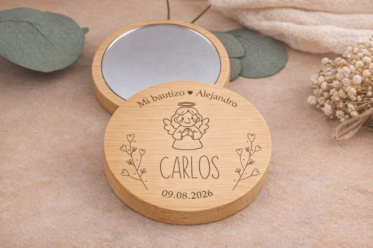 Fabricado en madera natural con espejo incorporado, se personaliza mediante grabado láser con el nombre del niño o niña y la fecha del bautizo, acompañado de un diseño infantil tierno (angelito o ilustración infantil), creando un recuerdo único y duradero.
