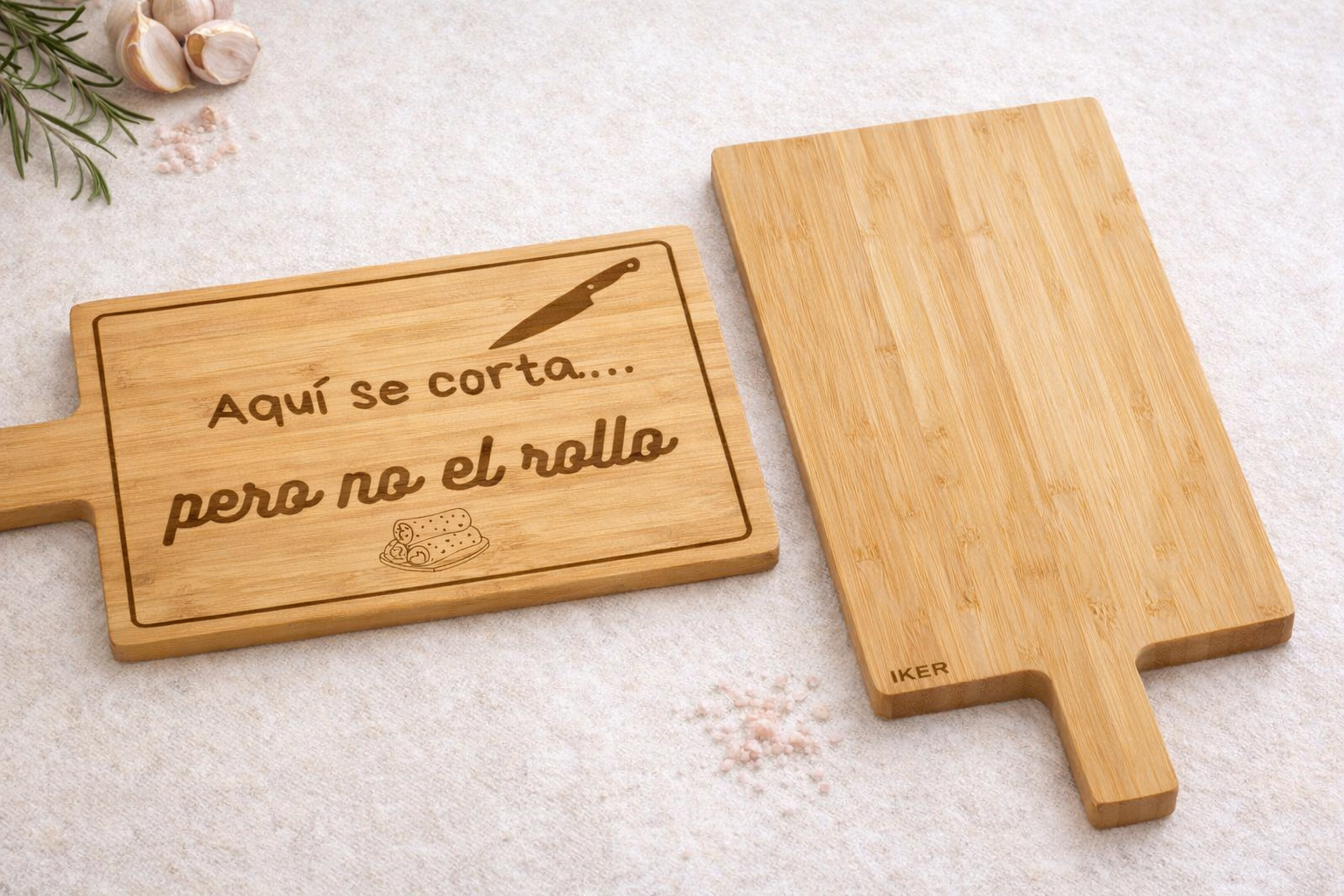 Fabricadas en madera natural tipo bambú, con un tamaño aproximado de 30 × 15 cm, cada tabla se graba con efecto artesanal para que el texto y los dibujos formen parte de la madera, no un simple estampado.